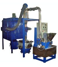 スクリューフィードに連結した微粉砕機、非常に効果の高いサイクロンダストコントローラユニット及び制御パネルで構成されており、塗料に接する全ての部材はステンレスを使用している。