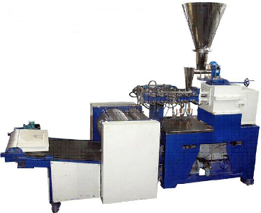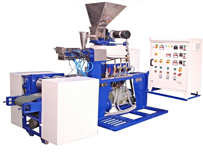 エクストルーダから押出された、溶けた樹脂を冷却されたロールに入り、薄板状になり、フレイカーユニットで粗粉砕される。